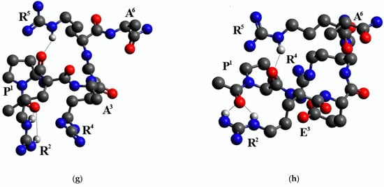 The lowest energy conformations of the peptides obtained at the dielectric constant, ε = 10. The carboxyl groups of the glutamic acid side chains were considered deprotonated and negatively charged, except for Ac-RER-NH2, which was considered neutral. Carbon atoms—gray spheres; oxygen atoms—red spheres; nitrogen atoms—blue spheres. Hydrogen atoms (white spheres) are not shown for clarity unless involved in highlighted hydrogen bonds. Hydrogen bonds between the proline residue and guanidinium groups of the arginine side chains in the Ac-PRARRA-NH2 and Ac-PRERRA-NH2 molecules are presented with dotted lines. The amino acid residues are enumerated. Ac-RAR-NH2 (a), Ac-RAAR-NH2 (b), Ac-REAR-NH2 (c), Ac-REAAR-NH2 (d), Ac-RER-NH2 (e), Ac-RERR-NH2 (f), Ac-PRARRA-NH2 (g), and Ac-PRERRA-NH2 (h).