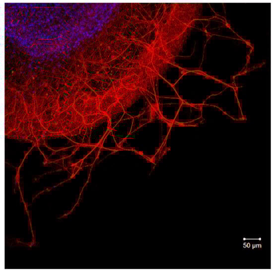 Fragment of DRG explant growth zone (third day of culturing). DRG explant is labeled with anti-neurofilament 200 antibody (red), while DAPI (blue) is used to visualize the cell’s nuclei. Scale bar 50 μm. Control.