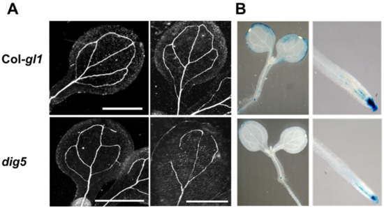 Figure 3. Leaf venation defects and reduced auxin levels in dig5 mutant seedlings. (A) Representative pictures of leaf venation in seedlings of wild type (Col-gl1) and dig5 mutant. Scale bars = 1 cm. (B) Expression of DR5-GUS reporter gene (GUS-staining) in wild type (Col-gl1) and dig5 seedlings.