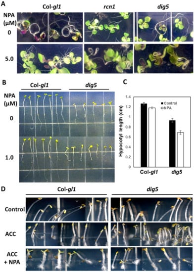 Figure 4. Abnormal root curling and apical hook formation of dig5 mutants. (A) Root curling of Col-gl1, rcn1, and dig5 seedlings in the absence or presence of 5 µM NPA. (B) Hypocotyl elongation of Col-gl1 and dig5 in the absence or presence of 1.0 µM NPA. (C) Hypocotyl length of seedlings in (B). Data are means and standard deviation from 18 seedlings. (D) Apical hook formation of seedlings under the control, ACC (10 µM), and ACC (10 µM) + NPA (1 µM) treatments. Seedlings were germinated and grown in darkness for 3 days before taking the pictures.