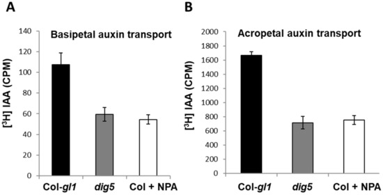 2.4. Polar Auxin Transport Was Impaired in dig5