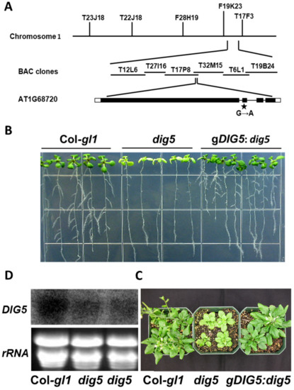Figure 6. Map-based cloning of the DIG5 locus and complementation of the dig5 mutants. (A) Map-based cloning of the DIG5 locus. After delimiting the DIG5 locus to an interval of about 105 kb, DNA sequencing identified a single nucleotide mutation in the gene At1g68720. (B,C) Complementation of the dig5 mutants with the wild type genomic DNA of At1g68720. Shown are the wild type Col-gl1, dig5, and dig5 mutant transformed with the wild type DIG5 genomic DNA (gDIG5:dig5) on agar plates (B) or in soil (C). (D) Expression level of the DIG5 gene in the wild type and dig5 mutant seedlings. Shown are RNA blotting of total RNA probed with the radiolabeled DIG5 probe (upper panel) and loading control of ethidium bromide stained rRNA (lower panel).