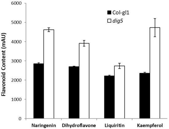 Our study showed that the dig5 mutant was defective in polar auxin transport. Since DIG5 did not encode a transporter but rather a putative enzyme (which we thought at the time we conducted the experiments), we hypothesized that there might be metabolite changes in dig5 that affect auxin transport. Plants have endogenous metabolites such as flavonoids that can regulate auxin transport under physiological conditions [36]. Indeed, flavonoids, such as quercetin, kaempherol, and apigenin, are endogenous inhibitors of polar auxin transport that can regulate auxin transport and impact root development [37,38]. We therefore examined whether there were any changes in the levels of these flavonoids in dig5. Roots of dig5 and wild type seedlings were harvested and extracted to measure flavonoids using an HPLC method. Our data showed that the levels of flavonoids, including naringenin, kaempherol, dihydroflavone, and liquiritin were all higher in dig5 than in the wild type. Particularly, the level of kaempherol in dig5 was twice that of the wild type (Figure 8).