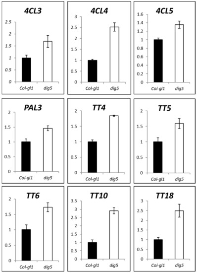 The fact that dig5 mutants had higher contents of flavonoids suggests that there may be increased biosynthesis of these metabolites. To test this possibility, we performed quantitative real-time PCR to measure the expression of major flavonoid biosynthesis genes in the roots of dig5 in comparison with the wild type. The flavonoid biosynthesis pathways are well studied in Arabidopsis and other plants, through genetic and biochemistry approaches [39,40,41]. Flavonoids are synthesized from phenylalanine through the phenylpropanoid pathway where the first enzyme of the pathway phenylalanine ammonia-lyase (PAL) converts phenylalanine into cinnamate, which is then converted to ρ-coumarate. ρ-coumarate is further catalyzed by 4-coumarate coenzyme A ligase (4CL) to form 4-coumarate coenzyme A (CoA). Chalcone synthase (CHS/TT4) then combines 4-coumarate CoA with malonyl-CoA to produce naringenin chalcones. Chalcone isomerase (CHI/TT5) isomerizes chalcones into naringenin, which is catalyzed by flavanone 3-hydroxylase (F3H/TT6) into dihydroflavones. In the late part of the pathway, flavanol synthase (FLS) converts various dihydrofavones into common flavanols, such as kaempferol and quercetin [40]. Our quantitative real-time PCR analyses found that there was significantly increased expression of major genes in the flavonoid biosynthesis pathway: PAL3, 4CL3, 4CL4, 4CL5, TT4, TT5, TT6, TT10, and TT18 (Figure 9). The higher expression of these genes in dig5 may contribute to increased syntheses of flavonoids in the mutant.