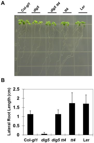 Figure 10. Loss-of-function mutation of TT4 rescued the development defects in lateral roots of dig5 mutant seedlings. The dig5 tt4 double mutant was generated by genetic crossing. (A) Morphology of 2-week-old seedlings grown on 1/2 MS medium. (B) Total lateral root length per plants. Data are means and standard deviation from 6 seedlings.