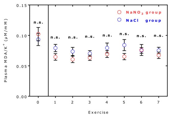 2.7. Effects of Supplementation and Exercise on Plasma Malondialdehyde and Potassium Ions