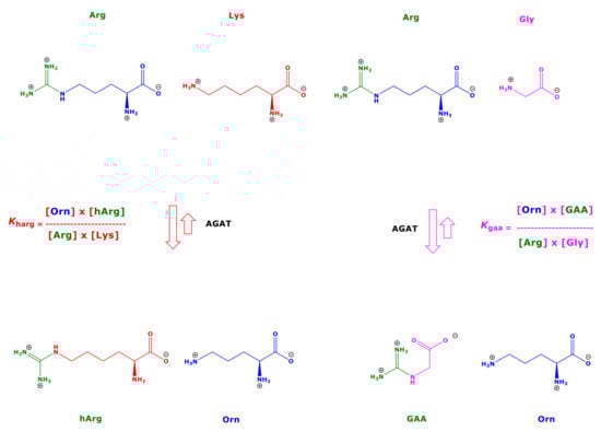 2.4. Effect of Supplementation on the Equilibrium Constants of the AGAT-Catalyzed Reactions Producing Guanidinoacetate and Homoarginine