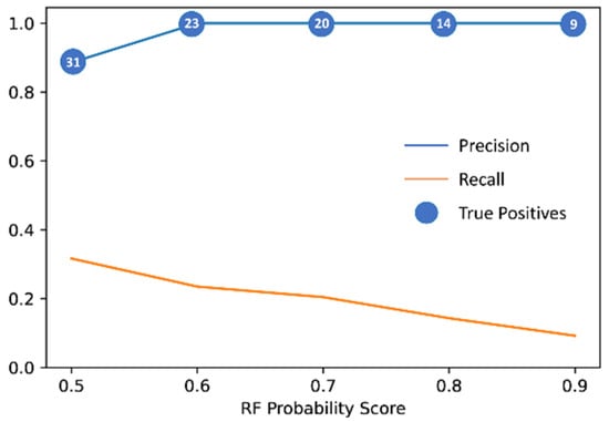 Looking at Figure 1, it can be observed that after the first threshold increase, the Precision score achieves the maximum possible value, which is maintained with the other thresholds. However, according to what discussed above, by increasing the PS threshold the number of true positive predictions is reduced. Indeed, the RF model was still able to predict 23 true positives (out of a total of 91 active instances) with the threshold of 0.6, whereas only 9 true positives were identified when 0.9 was considered as the classification threshold. These findings show that using a classification threshold of at least 0.6 maximizes the Precision of the model, thus providing an important indication for identifying new active compounds through VS studies.