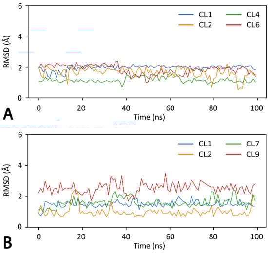 With the aim of providing a hypothetical binding orientation of CPD1 and CPD4 inside Cdk5 binding site, molecular docking, MD simulations and binding free energy evaluations were performed by using the X-ray structure of Cdk5 in complex with a naphtyridine inhibitor (PDB code 7VDR) []. CPD1 and CPD4 were subjected to a robust docking procedure with GOLD software by using the PLP scoring function. The docking results were clustered within a threshold of 2.0 Å and the representative binding modes were filtered based on cluster population and presence of H-bonds with the protein hinge region (see the Material and Methods for details). A total of four potentially reliable binding conformations were thus identified for both CPD1 and CPD4. Each binding mode was then analyzed through a 100 ns MD simulations protocol aimed at evaluating the stability of the predicted binding disposition of the ligands and their key interactions with the protein. The root-mean square deviation (RMSD) of the ligand’s position during the MD, with respect to the original docking pose, was thus analyzed for each studied ligand–protein complex. The analysis showed high stability of all binding modes predicted for CPD1, with an average RMSD around or below 2 Å (Figure 2A). Similar results were obtained for CPD4, whose RMSD values did not exceed an average of 3 Å, although cluster 9 presented larger fluctuations (Figure 2B).