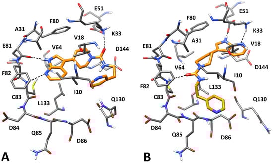Based on the results obtained from the MM-PBSA analysis, two binding dispositions for CPD1 (clusters 1 and 2) and one for CPD4 (cluster 7) were selected for a visual analysis. Figure 3 shows the binding modes refined through the MD simulations predicted for CPD1. Based on the most energetically favorable binding disposition of CPD1, represented by cluster 1, the ligand places its azaindole core within the hinge region of the protein, forming two different H-bonds with the backbone nitrogen of C83 and the backbone oxygen of E81 through its pyridine nitrogen and pyrrole NH, respectively. Moreover, the bicyclic core forms hydrophobic interactions with V18, A31, V46, F80 and, in particular, with L133, over which it perfectly lays. The carbonyl group of CPD1 establishes an additional H-bond with K33, which further stabilizes the binding mode of the ligand. Finally, the piperidine moiety of CPD1 shows lipophilic interactions mainly with V18 and F80, whereas the pyridine ring forms an NH-π interaction with the side chain of Q130 and takes hydrophobic contacts with I10 and V18; all these interactions appear to stabilize the bent conformation of the terminal part of the ligand. In the binding orientation represented by cluster 2 (Figure 3B), CPD1 forms only an H-bond with the amide backbone of C83, within the hinge region of Cdk5, through its central carbonyl group. In fact, the azaindole core of the ligand is located outside the hinge region of the protein and participates in a double H-bond interaction with K33 and E51. Specifically, the pyridine nitrogen acts as an H-bond acceptor with K33, whereas the pyrrole NH group acts as an H-bond donor with E51. Moreover, the bicyclic core of the ligand forms hydrophobic interactions mainly with F80, whereas the piperidine ring shows lipophilic interactions with V18, A31, V64 and L133. Finally, the terminal pyridine moiety of CPD1 is located in the solvent-exposed region of the binding site, forming van der Waals interactions only with I10 and D86. Although both binding modes predicted for CPD1 appear as reliable, since most kinase inhibitors present an H-bond donor/acceptor moiety that interact with the hinge region residues, the binding mode of CPD1 represented by cluster 1 is believed to be more reliable than the binding disposition represented by cluster 2. This is also in agreement with the binding free energy values obtained for the two binding dispositions of CPD1, suggesting cluster 1 as the most energetically favored one.