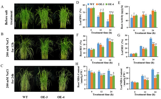 Overexpression of OsABT enhances the salt tolerance of rice seedlings. (A–C) Phenotypes of two-week-old OsABT–OE lines (OE–3 and OE–4) and wild-type (WT) plants under 200 mM NaCl for 0, 12 and 24 h. Scale Bar: 5 cm. (D–I) Relative leaf water content; root activity; relative root and leaf conductivity; root and leaf malondialdehyde (MDA) content of OsABT–OE lines and WT under 200 mM NaCl for 0, 12, and 24 h. Data are means ± SD of three independent experiments. Asterisks indicate significant differences compared to WT plants at * p < 0.05 and ** p < 0.01 (Student’s t-test).