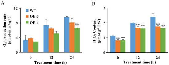 Changes of reactive oxygen species (ROS) in roots of various rice plants under salt stress. O2•− production rate (A) and H2O2 content (B) in roots of two–week–old OsABT–OE lines (OE–3 and OE–4) and WT plants under 200 mM NaCl for 0, 12, and 24 h. Data are means ± SD of three independent experiments. Asterisks indicate significant differences compared to WT plants at ** p < 0.01 (Student’s t–test).