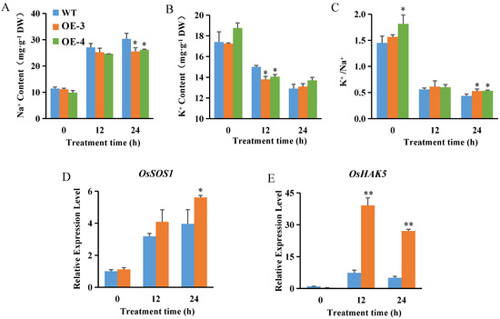 An important aspect of salt tolerance is the avoidance of Na+ accumulation and K+ homeostasis [52]. Two-week-old hydroponically grown OsABT–OE lines and WT plants were exposed to 200 mM NaCl. The level of Na+ in the roots increased continuously in all plant lines under salt stress. However, the OsABT–OE lines accumulated significantly less Na+ than the WT plants, especially after 24 h of salt treatment (Figure 3A). In contrast to Na+ levels, K+ levels declined in the roots of all plant lines during salt stress. At 24 h of salt treatment, the K+ content in OsABT–OE lines was higher than that in WT plants (Figure 3B). A decrease in the K+/Na+ ratio was detected in all plant lines under salt stress. However, a markedly higher K+/Na+ ratio was observed in the OsABT–OE lines than in the WT plants after 24 h of salt treatment (Figure 3C). These results imply that OsABT can inhibit Na+ accumulation and maintain a high K+/Na+ ratio in the roots, thereby maintaining the balance between Na+ and K+ in rice root cells.