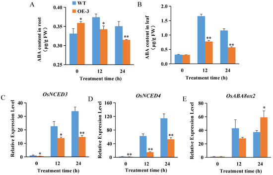 The root expression of the ABA synthesis genes OsNCED3 and OsNCED4, and the ABA catabolic gene OsABA8ox2 were further examined. The results showed that the expression of these genes was dramatically induced in all plant lines under salt stress. Compared to the WT plants, the expression of OsNCED3 and OsNCED4 in OE–3 was lower, while that of OsABA8ox2 in OE–3 was higher. At 24 h of salt treatment, the expression levels of OsNCED3 and OsNCED4 in OE–3 was only 43.55% and 46.24% of WT, while the expression of OsABA8ox2 was 1.59-fold of WT (Figure 4C–E). ABA is synthesized in roots and transported to the leaves for accumulation under salt stress [33]. These results indicate that OsABT can inhibit ABA synthesis in rice roots by inhibiting the expression of ABA synthesis genes and promoting the expression of ABA catabolic genes, thereby reducing the leaf ABA content.