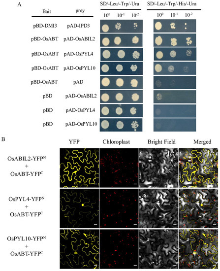 OsABT interacts with key factors of the ABA signaling pathway. (A) Yeast two hybrid (Y2H) assay of the interactions between OsABT and the three ABA signaling proteins OsABIL2, OsPYL4, and OsPYL10. GAL4 binding domain (BD) and GAL4 activation domain were co–transformed into yeast YRG2, and a series of 2 μL aliquots of the diluted (OD600 = 1, 0.1, 0.01) co–transformed YRG2 culture was spotted on SD/−Leu/−Trp/−Ura and SD/−Leu/−Trp/−His/−Ura media and incubated for 4 days. (B) Bimolecular fluorescence complementation (BiFC) assay of the interactions between OsABT and OsABIL2, OsPYL4, OsPYL10 in Nicotiana benthamiana leaves. Scale bars: 50 μm.