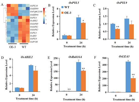 OsABT negatively regulates ABA signal transduction pathway. (A) Cluster analysis of differentially expressed genes (DEGs) in ABA signal transduction between OE–3 and WT at 24 h of salt treatment. Each column in the figure represents a sample, and each row represents a gene. Log2 processing was performed on the fragments per kilobase of exon per million mapped fragments (FPKM) value of these DEGs. (B–F) Root expression levels of ABA–related genes in 2–week–old OsABT–OE line (OE–3) and WT plants. Root RNA was isolated and used for qRT–PCR. Actin was used as an internal control. The relative expression levels were represented by fold change relative to the WT expression levels before salt treatment (0 h). Data are means ± SD of three independent experiments. Asterisks indicate significant differences compared to WT at * p < 0.05 and ** p < 0.01 (Student’s t–test).