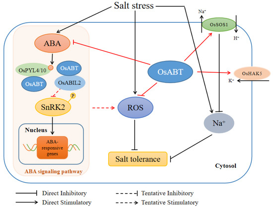 Therefore, the relationship between ABA and salt tolerance deserves further attention. Xu et al. [61] found that the accumulation of ABA and the expression of the ABA synthesis gene OsNCED3 were upregulated in SiMYB19 transgenic rice, which showed improved salt tolerance compare with WT rice. Zhang et al. [62] found that OsNAC45 positively regulates the ABA signaling pathway and confers salt tolerance in rice. Interestingly, OsSAE1 negatively regulates the ABA signaling pathway and positively regulates salt tolerance in rice seedlings by inhibiting the expression of OsABI5 [63]. Chen et al. [51] found that OsABT inhibits the ABA signaling pathway by interacting with OsABI2, and the tolerance to salt stress was higher in OsABT overexpressing Arabidopsis than in wild type plants. In this study, OsABT negatively regulated ABA synthesis and signaling pathways and conferred salt tolerance in rice. Salt tolerance is a complex trait involving many genes and pathways, but accumulating evidence has revealed multifaceted crosstalk between the ABA signaling pathway and the SOS signaling pathway. For example, SOS2 is able to physically interact with ABI2 and it is disrupted by the abi2-1 mutation, which causes increased tolerance to salt shock and ABA insensitivity in plants [64]. Meanwhile, there is an inseparable connection between the ABA signaling and ROS. ABA regulates ROS production through plasma membrane and mitochondria-localized NADPH oxidases. These ROS act as important secondary messengers in regulating root growth, stomatal movement, and seed germination through the ABA signaling pathway [65]. In vitro analyses indicated that H2O2 could in turn inactivate the activities of the PP2C enzymes ABI1 and ABI2 [66,67]. In the future, it will be interesting to know whether OsABT interacts with salt stress-related proteins, especially Na+/K+ transporters, and reduces the ROS levels in rice roots by negatively regulating the ABA signaling pathway.