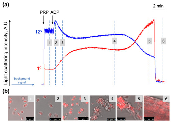 Registration of platelet transformations (shape change, aggregation, and clot formation) by laser diffraction method. (a) PRP diluted in the HEPES buffer (1 × 107 platelets/mL) was added to the cuvette with continuous stirring (1200 rpm) at 25 °C. After 2 min of incubation, ADP (800 nM) was added, and light scattering intensity (LSI) was monitored for the scattering angles of 1° and 12°. For better visualization, the LSI signal at 12° was amplified by 50; (b) at each step of platelet transformation, samples were withdrawn from the LaSca cuvette, fixed with formaldehyde (2%), and then stained with Nile Red (3 µg/mL, 10 min, RT) for confocal microscopy analysis of platelet aggregation and clot formation (Photos 1–6). Shown are the original representative traces and photos from four independent experiments.