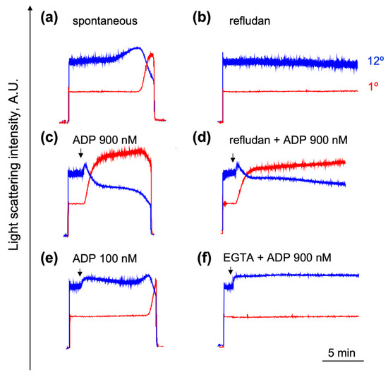 During disaggregation, the LSI signals measured at 1° and 12° were contradirectional (Figure 1, the area between points four and five; Figure 2). The platelet disaggregation process strictly depended on the agonist concentration and temperature (Figure 2). The registration of the clot formation reaction by the laser diffraction was not characterized previously [26]; therefore, here we present a detailed analysis of this reaction. In our experimental conditions, a spontaneous, i.e., without platelet stimulation by agonists, clot formation was observed after 12 ± 3 min of platelet suspension stirring in the presence of 2 mM of calcium at 25 °C. Refludan completely prevented the reaction by inhibiting thrombin generation, and the LSI signals remained at the initial level for at least 40 additional min (Figure 2a,b). Platelet activation by a high (900 nM) ADP concentration induced a shape change and aggregation reaction and slightly reduced the time to clot formation (10 ± 3 min). Refludan, in this case, again completely prevented clot formation, but not the shape change and aggregation (Figure 2c,d). When the platelets were stimulated by a low (100 nM) ADP concentration, which induced only a shape change reaction without aggregation, the clot formation time did not differ significantly from the spontaneous reaction and was inhibited by the Refludan also (Figure 2e). Clot formation and platelet aggregation are strictly dependent on extracellular calcium; however, in the presence of EGTA, only a shape change was initiated and both of the platelet reactions were inhibited (Figure 3f).