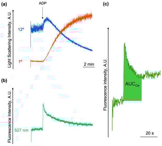Simultaneous registration of platelet transformation and changes in [Ca2+]i. PRP was loaded with Fluo-3 AM (5 µM), then diluted in HEPES buffer (1 × 107 platelets/mL) and added to the cuvette with continuous stirring (1200 rpm) at 25 °C. After the registration of the basal signal (3 min), ADP (800 nM) was added to the platelet suspension. (a) The platelet shape change reaction and aggregation were monitored as in Figure 1 and Figure 2 according to the changes of LSI signal measured at 12° and 1°, correspondingly, and (b) [Ca2+]i signal was detected at FL1 channel; (c) to characterize ADP-induced [Ca2+]i changes in dynamics, the AUCCa within the first 20 s after the application of ADP was calculated. Raw traces from the LaSca laser analyzer, shown are the data from one experiment out of four.