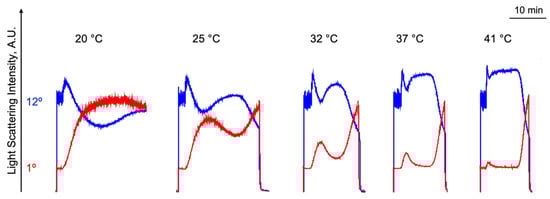 ADP-induced platelet transformation at different temperatures. PRP diluted in HEPES buffer (1 × 107 platelets/mL) was added to the cuvette with a continuous stirring (1200 rpm) at 25 °C. After 2 min of incubation, ADP (300 nM) was added and dynamical changes in light scattering intensity were registered for the scattering angles of 1° and 12° at 20 °C, 25 °C, 32 °C, 37 °C, and 41 °C. For better visualization, the data of LSI at 12° were multiplied by 50. Shown are the original representative traces from four independent experiments.