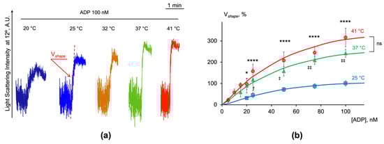 With the LaSca-TMF device, we were able to detect a platelet shape change starting from a very low dose (5 nM) of ADP (Supplementary Figure S1) and with a maximal velocity achieved at 100 nM of ADP. The amplitude and velocity of the shape change reaction gradually increased with the rising temperature under ADP stimulation (Figure 5a). The velocity of the shape change reaction (Vshape) was calculated by the original LaSca v.1498 software. To characterize the shape change reaction and compare the velocity at different temperatures, we analyzed the platelet responses triggered by ADP in the range from 5 to 100 nM and calculated the Vshape for each. The Vshape triggered by 100 nM of ADP at 25 °C was taken as 100% (Figure 5b). Then, the normalized Vshape values were plotted against the ADP concentration and analyzed.