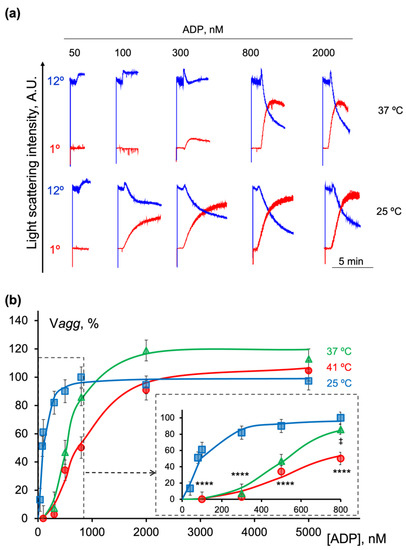 Initiation of platelet aggregation and its velocity were differentially regulated by temperature. PRP diluted in HEPES buffer (1 × 107 platelets/mL) was added to the cuvette with a continuous stirring (1200 rpm) at the indicated temperature. After 2 min of incubation, indicated concentrations of ADP were added and the LSI signal was monitored in dynamics at 1° and 12°. For better visualization, the data of LSI at 12° were multiplied by 50. (a) Shown are the original representative traces from four independent experiments; (b) the dose-response curve of aggregation velocity (Vagg) plotted against ADP concentrations. Points indicate the normalized Vagg data, continuous lines represent fits of the Hill equation to the experimental data. The enlarged part of the graph of the initial steps of aggregation is shown in a separate box. Data are presented as means ± SD, two-way ANOVA, Tukey’s post-hoc; **** p < 0.0001, ‡, p = 0.0075 compared to 25 °C, n = 6.