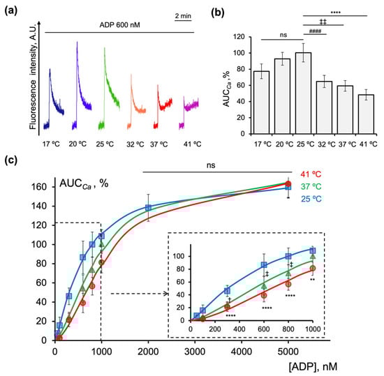 [Ca2+]i decreased significantly with the temperature rise. PRP was stained with Fluo-3 AM (5 µM, 30 min, RT), diluted in HEPES buffer (1 × 107 platelets/mL), and added to the cuvette with continuous stirring (1200 rpm) at indicated temperatures. After 2 min of incubation, ADP (600 nM) was added, and [Ca2+]i was assessed in dynamics according to the Fluo-3 fluorescence registered at FL1 (527 nM). (a) Representative traces from four independent experiments; (b) quantification of the data presented in (a); (c) dose-response curves of AUCCa plotted against ADP concentration. For all calculations, the AUCCa for 800 nM ADP-stimulated platelets at 25 °C was taken as 100%. Points indicate the normalized AUCCa data, and continuous lines represent fits of the Hill equation to the experimental data. The dose-dependency of AUCCa at the low concentrations of ADP (from 5 to 1000 nM) is emphasized in the separate box. Data are presented as means ± SD, n = 8; for (b) one-way ANOVA, Tukey’s post-hoc; ns: not significant; ****, p < 0.0001 (25 °C vs. 41 °C), ‡‡, p < 0.0001 (25 °C vs. 37 °C), ####, p < 0.0001 (25 °C vs. 32 °C). For (c) two-way ANOVA, Tukey’s post-hoc; †, p < 0.05, ‡, p < 0.0001 (37 °C vs. 25 °C); **, p = 0.0063, ****, p < 0.0005 (41 °C vs. 25 °C).