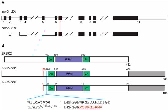 The zebrafish genome contains a single copy of the zrsr2 gene localized on chromosome 11. It encodes two major isoforms, isoform 201 (635 amino acids in length; GenBank accession number: XM_021479948) and isoform 204 (483 amino acids in length; GenBank accession number: XM_021479949). Isoform 204 has a longer 5′ untranslated region due to alternate splicing between exons 3 to 6, and its translation start site lies in exon 6 (Figure 1A). Thus, the protein encoded by isoform 204 lacks the first 152 amino acids but is otherwise identical to isoform 201 (Figure 1B). The major ZRSR2 isoform in humans is isoform 201 which contains all known functional domains (482 amino acids in length; GenBank accession number: NM_005089). The alignment of both zebrafish isoforms with human ZRSR2-201 showed an overall protein similarity of 58%, with a higher level of similarity between the functional domains (Figure 1B, Supplementary Figure S1). Interestingly, there is an extra sequence of 140 amino acids at the C-terminus of the zebrafish Zrsr2 compared to the human ZRSR2 (Figure 1B, Supplementary Figure S1). Analysis of this extra C-terminus part by BLASTp (https://blast.ncbi.nlm.nih.gov/ accessed on 21 October 2019) showed that it is also present in the ZRSR2 orthologs from other species of fish. However, this region did not show any recognizable functional domains.