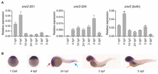 2.2. Both Isoforms of zrsr2 Are Ubiquitously Expressed during Embryonic Development