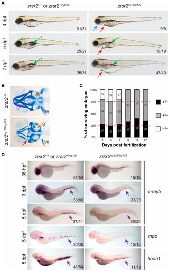 To generate a template for zrsr2 riboprobe synthesis for WISH, we performed RT-PCR using RNA from 5 dpf WT embryos and primers from the region shared by both isoforms (Supplementary Table S1). The RT-PCR product was cloned into a pCR4-TOPO vector (Thermo Fisher Scientific, Waltham, MA, USA) and sequence-verified by Sanger sequencing. The plasmid DNA was extracted using QIAprep Spin Miniprep Kit (Qiagen, Germantown, MD, USA), digested with SpeI, and labeled with a DIG labeling kit (Sigma-Aldrich, St. Louis, MO, USA) using T7 polymerase. Antisense riboprobes for all other WISH markers used in this study were also generated using a DIG labeling kit (Sigma-Aldrich, St. Louis, MO, USA). Zrsr2hg129/+ fish were in-crossed, and embryos were collected at various developmental stages. Collected embryos were euthanized and fixed overnight in 4% PFA at 4 °C. WISH was performed as described previously []. For o-dianisidine staining, euthanized embryos were incubated in o-dianisidine (MP Biomedicals, Costa Mesa, CA, USA) solution for 15 min in the dark [], followed by fixation in 4% PFA prior to imaging. Embryos used for WISH and o-dianisidine staining were genotyped via fluorescent PCR, as described previously [], using REDExtract-N-Amp PCR ReadyMix (Sigma-Aldrich, St. Louis, MO, USA) for product amplification.