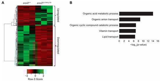 Loss of zrsr2 leads to global gene expression changes in metabolic processes. (A) Heatmap of the differentially expressed genes in zrsr2hg129/hg129 embryos compared to their WT controls at 3 dpf, with the color key shown below the heatmap. An amount of 455 genes were upregulated, and 917 genes were downregulated in the zrsr2hg129/hg129 samples (fold change ≥ 2, p < 0.05). (B) Bar graph of the top 5 biological processes enriched among 917 downregulated genes in zrsr2hg129/hg129 embryos at 3 dpf, with enrichment visualized by −log10 (p-value). Metabolic processes and transport of ions, vitamins, and lipids are among the most significantly enriched pathways among the downregulated genes.