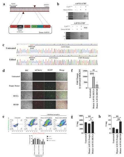 Recently, we developed a gene therapy strategy based on a CRISPR/nCas9 system with encouraging findings in MPS IVA fibroblasts [24,25]. In this work, we took advantage of this genome editing tool to evaluate its usefulness in GM2 gangliosides fibroblasts. In this new approach, after a double enzyme restriction with the MfeI and MluI enzymes, we introduced the encoding HEXA or HEXB cDNA into Donor AAVS1:Empty, resulting in an expression cassette that was further inserted into the AAVS1 locus in a double-nicking Cas9-dependent cut (Figure 1a–c). These results show that several genes can be easily cloned in our Donor AAVS1 through enzymatic restriction, supporting its use as a versatile donor plasmid for treating different genetic diseases.