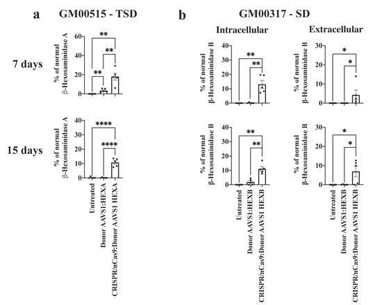 Short- and medium-term genome editing on GM2 fibroblasts. (a) Intracellular Hex A enzyme activity for TSD fibroblasts 7 and 15 days post-edition (n = 4). (b) For SD fibroblasts, the intra- and extracellular Hex B activity are shown in the left and right panels, respectively (n = 4). * p ≤ 0.05, ** p ≤ 0.01, **** p ≤ 0.0001. Mann–Whitney U test.