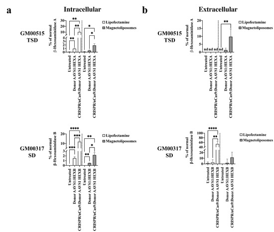 β-hexosaminidase activity on long-term edited GM2 fibroblasts. The intracellular (a) and extracellular (b) enzyme activity to wild-type levels for GM00515-TSD and GM00317-SD fibroblasts is shown (n = 4). * p ≤ 0.05, ** p ≤ 0.01,*** p ≤ 0.001, **** p ≤ 0.0001. Two-tailed Student’s t-test.