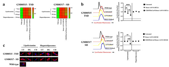 Although primary accumulation in SD and TSD corresponds to GM2 gangliosides inside the lysosome, secondary GAGs accumulation can also occur [2,26,27]. To evaluate the global impact of our CRISPR/nCas9-based genome editing strategy on this classical biomarker, we determined the total GAGs accumulation and the lysosomal mass. Untreated TSD and SD fibroblasts showed an increased GAGs amount with respect to the wild type, suggesting a global impairment in the lysosomal function. In concordance with the β-hexosaminidase activity assays for short-, medium-, and long-term edition, a significant reduction in the GAGs, close to wild-type levels, was observed by using LPs-assisted delivery in TSD and SD fibroblasts (Figure 6a). A substantial decrease of 40% and 27% in lysosomal mass in TSD and SD fibroblasts was observed after LPs-assisted delivery, respectively (Figure 6b,c). On the other hand, we failed to detect any significant changes in the GAGs or lysosomal mass for TSD and SD fibroblasts with MLPs-assisted delivery (Figure 6). These experiments showed the need to reach high intracellular β-hexosaminidase activity to recover the lysosomal mass, which was possible with the LPs but not with the MLPs. Further assays such as lipids staining with NileRed [10,28] will be conducted in future work to support these observations, where the Donor AAVS1 will be employed without GFP, given that fluorescence from both reporters should be collected with an FITC-associated laser [10].