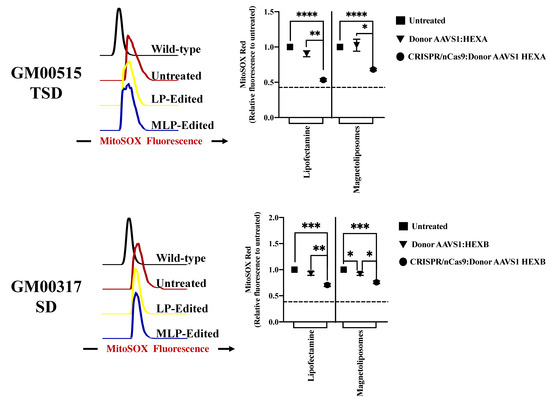 mtROS response on long-term edited GM2 fibroblasts. MitoSOX red fluorescence intensity for GM00515-TSD and GM00317-SD fibroblasts after one month of treatment. The left panels show representative histograms, while the right panels show the mean of three independent experiments. * p ≤ 0.05, ** p ≤ 0.01, *** p ≤ 0.001, **** p ≤ 0.0001. Two-tailed Student’s t-test.