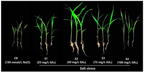 Salinity is a major disruptor of plant development, and it has contributed to a major decline in global crop production [,,]. Elevated salt ion concentrations impair photosynthesis, cellular metabolism, and nutritional balance []. Moreover, emerging evidence has suggested that salt stress induces modifications in the lipid bilayer and membrane permeability [,,]. Exogenous plant growth phytohormones administration is considered an efficient approach to alleviating negative salinity outcomes. Among the known phytohormones, gibberellin is a known inducer of plant development under salinity conditions [,]. Prior investigations revealed that exogenous gibberellic acid (GA3) usage accelerates seed germination, enhances seed salt tolerance, and alleviates the salt-mediated suppression of seedling development []. It has also been concluded that GA3 usage diminishes harmful salinity outcomes while enhancing salinity resistance in the mustard plant []. Sorghum (“Jitian 3”) is a salt-tolerant seed cultivar that has frequently been used in China over a minimum of 40–50 centuries in arid, semiarid, and water-logged locations. Despite some reports on the outcomes of foreign GA3 application in plants under salt stress, there are limited investigations on sorghum. Hence, the underlying signaling behind the GA3-mediated regulation of plant development under salt stress remains poorly understood.