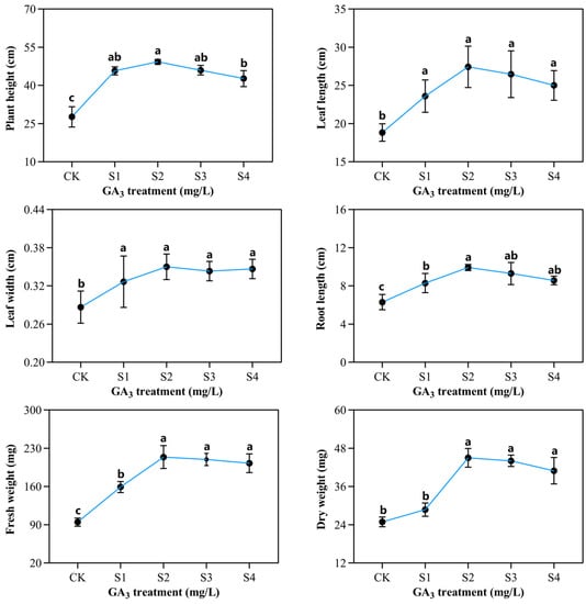 The outcome of varying exogenous GA3 concentrations on the phenotypic variations of sorghum seedling development under 150 mM NaCl exposure. CK—0 mg/L GA3; S1—25 mg/L GA3; S2—50 mg/L GA3; S3—75 mg/L GA3; S4—100 mg/L GA3. Six sorghum plants from GA3 treatment (n = 3) and the control group (n = 3) were used for phenotypic determination, including plant height, leaf width, fresh weight, leaf length, root length, and dry weight. All data are presented as the mean ± SD, Superscript different lowercase letters means significant difference (p < 0.05), Superscript same lowercase letters means significant difference showed no significant difference (p > 0.05).
