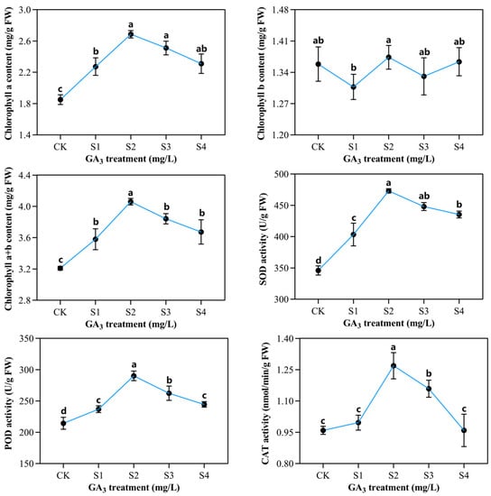The influence of varying exogenous GA3 concentrations on chlorophyll content and antioxidant enzymatic activities of sorghum seedlings developed in the presence of 150 mM NaCl. CK—0 mg/L GA3; S1—25 mg/L GA3; S2—50 mg/L GA3; S3—75 mg/L GA3; S4—100 mg/L GA3. Six sorghum plants from GA3 treated (n = 3) and control leaves (n = 3) were used for the determination of chlorophyll contents, as well as superoxide dismutase (SOD), peroxidase (POD), and catalase (CAT) activities. All data are presented as the mean ± SD, Superscript different lowercase letters means significant difference (p <0.05), Superscript same lowercase letters means significant difference showed no significant difference (p >0.05).
