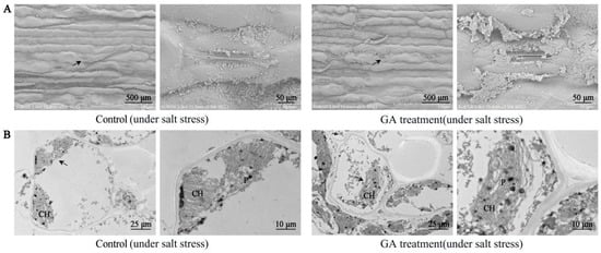 The outcome of GA3 treatment on the anatomical structure of sorghum leaves under salt stress. (A)—Influence of GA3 (50 mg/L) treatment on the epidermal structure and stomatal status of sorghum leaves under salt stress; (B)—influence of GA3 (50 mg/L) treatment on the cellular ultrastructure of sorghum leaves under salt stress; the figure on the right is an enlarged version of the area marked by a black arrow on the left figure. CH—chloroplast; P—plastoglobuli.
