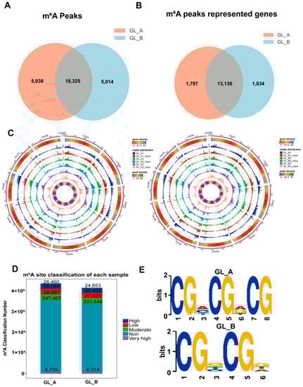 Transcriptome-wide m6A analysis in sorghum under GA3 treatment. (A) The quantity of common and distinct m6A peaks following GA3 (GL_A) versus control (GL_B) treatment. (B) A Venn diagram illustrating the m6A-associated mRNAs in both leaves. (C) m6A peak distribution across chromosomes in both leaves. (D) m6A site stratification in both leaves. (E) The top motif enrichments are related to m6A peaks in both leaves.
