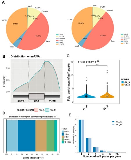 A summary of the m6A methylation (m6A-M) profile in sorghum under GA3 treatment. (A) Pie charts depicting the m6A peak distribution within transcripts. (B) Metagene plots illustrating the identified m6A peak regions within transcripts following GA3 (GL_A) and control (GL_B) treatments. (C) Violin plot revealing the m6A peak enrichment status distribution of individual leaves; *** p < 0.001. (D) The transcription-factor-binding loci distribution relative to TSS. (E) The quantity of m6A peaks per gene in the GL_A and GL_B leaves.