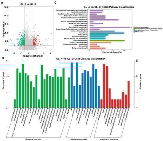 Differential m6A peaks of the pairwise comparison leaves. (A) Volcano plots depicting the differential peaks in the examined leaves. Red dots represent upregulated differentially methylated genes (DMGs) in GL_A group; green dots represent downregulated differentially methylated genes (DMGs) in GL_A group. (B) GO analysis for differentially methylated genes (DMGs). (C) KEGG network enrichment evaluation of DMGs.