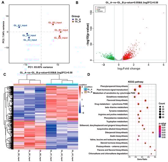 Analysis of differential expression, based on RNA-Seq data, between the analyzed leaves. (A) Principal component analysis (PCA) of Sorghum between the GA3-treated (GL_A, n = 3) and control (GL_B, n = 3) leaves. (B) Volcano plots depicting the differential gene expression between the examined leaves. (C) Heatmap plot of all DEGs. (D) KEGG network enrichment analyses of all DEGs.