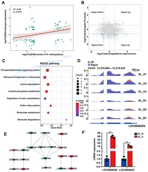 Combined analysis of the m6A- and RNA-seq data. (A) Log2FC (mRNA expression) versus log2FC (differential m6A methylation) dot plot depicting a strong and direct relationship between the sum of m6A-M and mRNA profile. (B) Four quadrant plots depicting DEGs with differentially methylated m6A peaks. Red dots represent the downregulated DEGs with hypermethylated m6A sites; Purple dots represent the upregulated DEGs with hypermethylated m6A sites; Green dots represent the downregulated DEGs with hypomethylated m6A sites; Blue dots represent the upregulated DEGs with hypomethylated m6A sites. (C) KEGG network enrichment analysis of genes depicting a considerable alteration in m6A and transcript expression. Different shades of colour represent the degree of significance. (D) m6A-modified LOC8066282 transcript data visualization. (E) Protein–protein interactions (PPIs) of genes with considerable alterations in m6A and mRNA transcript levels. Red annotated genes were upregulated DEGs in GL_A group, green annotated genes were downregulated DEGs in GL_A group. (F) Relative transcript expression, as evidenced by qPCR of critical genes in the examined leaves; ** p < 0.01.