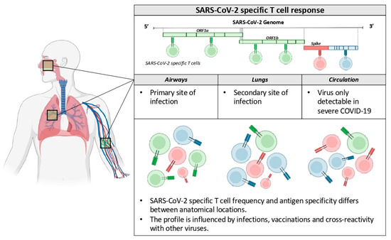 Studies related to SARS-CoV-2-specific T cells in the airways, the overall primary site of infection, in humans are still limited [89,90,91,92,93,94,95]. During acute SARS-CoV-2 infection, dynamic modifications of immune cell populations in different airway tissues (nasal, oropharyngeal cavity and lung tissues) have been described, with a preferential recruitment of granulocytes, inflammatory monocytes, macrophages and NK cells [94]. However, T cell enrichment was also detected, likely triggered by elevated levels of chemokines secreted into the tissues which were proportional to the levels of SARS-CoV-2 replication [96]. After resolution of the SARS-CoV-2 infection, tissue-resident SARS-CoV-2-specific memory T cells have been demonstrated. They can be found in different tissues (bone marrow, spleen, lung, and lymph nodes) [93] and persist for at least 6 months after infection. SARS-CoV-2 infection has also been shown to induce peripheral virus-specific T cells with phenotypic characteristics of tissue homing [97].