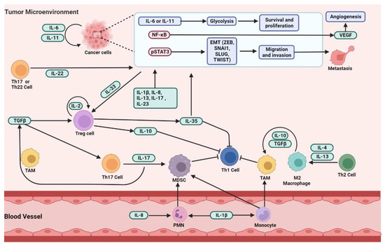 - Briukhovetska, D.; Dörr, J.; Endres, S.; Libby, P.; Dinarello, C.A.; Kobold, S. Interleukins in Cancer: From Biology to Therapy. Nat. Rev. Cancer 2021, 21, 481–499. [Google Scholar] [CrossRef]