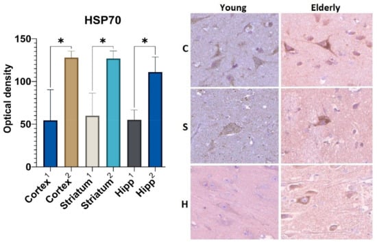 Figure 2. Results of HSP70 immunohistochemical staining: 1—young group, 2—elderly group; C—cortex, S—corpus striatum, H—hippocampus. *—differences are statistically significant (p < 0.05). Magnification 400×.