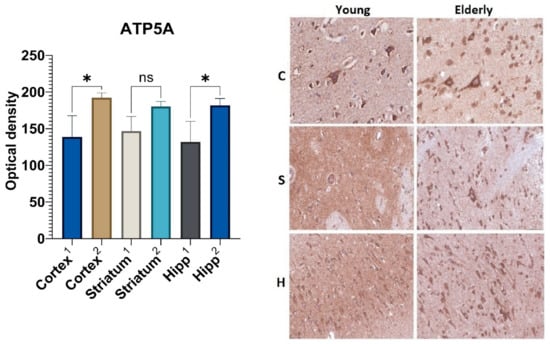 Figure 5. Results of ATP5A immunohistochemical staining: 1—young group, 2—elderly group; C—cortex, S—corpus striatum, H—hippocampus. *—differences are statistically significant (p < 0.05). ns—differences are not statistically significant (p > 0.05). Magnification 400× for “C” and “S”, Magnification 200× for “H”.